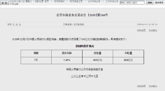 12月17日金融一线消息,2025年12月17日中国人民银行以固定利率、数量招标方式开展了468亿元7天期逆回购操作。